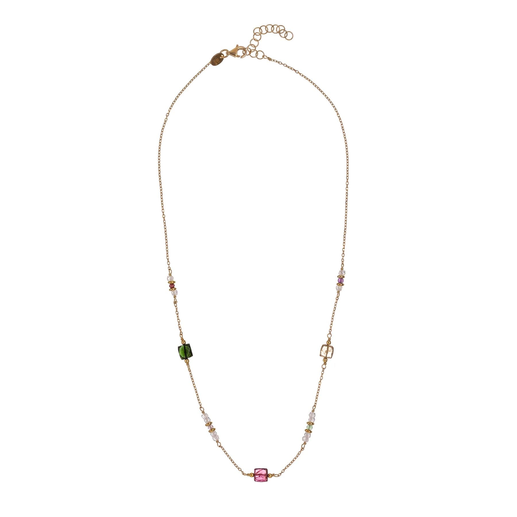 The Cardinal Simple Necklace is crafted in 925 sterling silver with 24 karat gold plating, featuring tourmalines and cubic zirconia. Part of a jewellery line that plays with shades, contrasts, shapes, and colours, it draws inspiration from the floral world, offering a vibrant and elegant design to elevate any look.