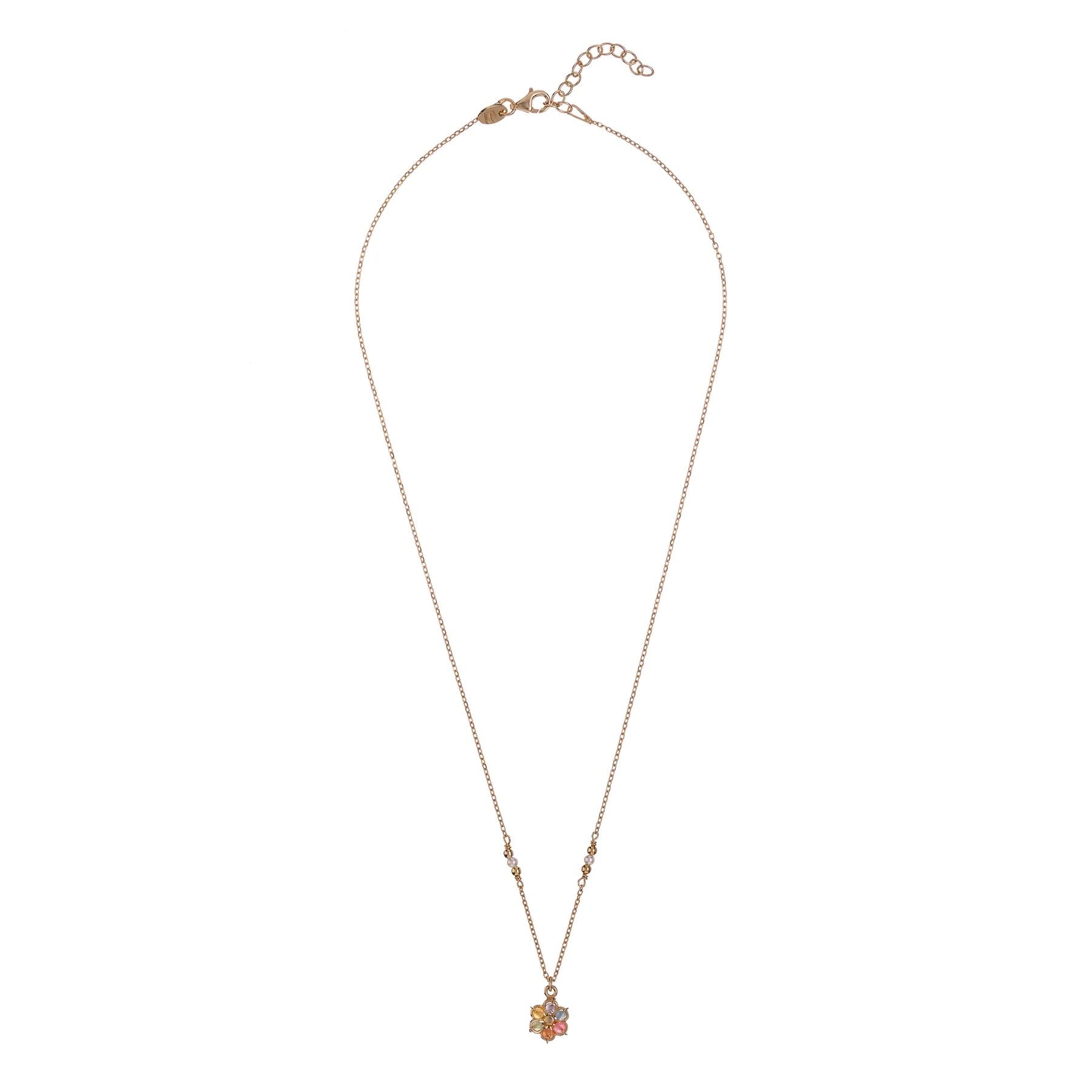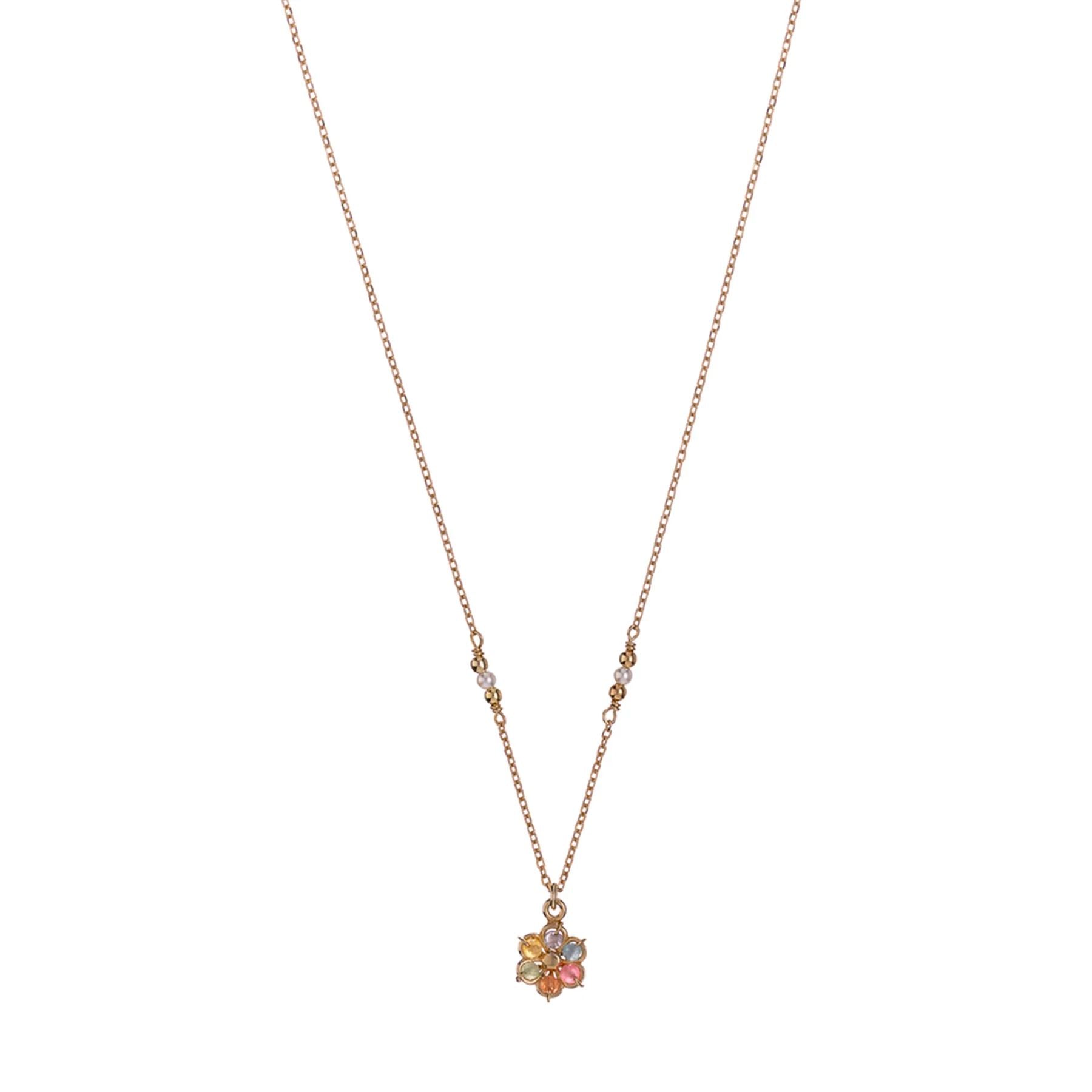 The Prim Rainbow Necklace is crafted in 925 sterling silver with 24 karat gold plating, featuring a fine chain with a radiant multicoloured flower made of shimmering gemstones, adorned with tiny luminous beads. This refined piece adds a touch of colour and sophistication to any look.