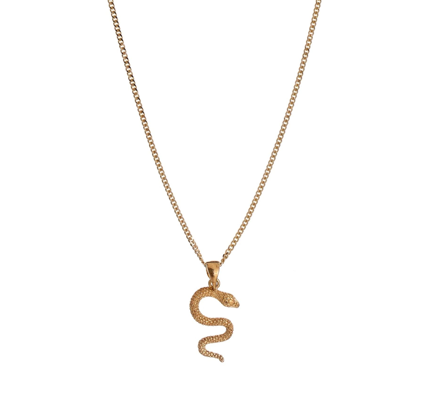 The Snake Necklace is crafted in 925 sterling silver with 24 karat gold plating, featuring a striking snake pendant. Symbolizing renewal and rebirth through its skin-shedding mythology, this bold piece adds a touch of ancient allure to any ensemble.