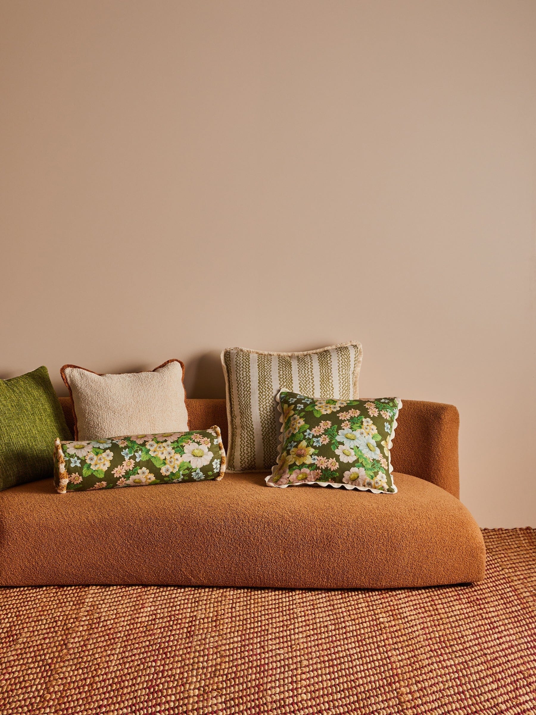 A rich olive green linen cushion featuring the delicate floral motifs of our Buttercup print. A grounding, garden-inspired layer that pairs beautifully with warm or neutral tones.