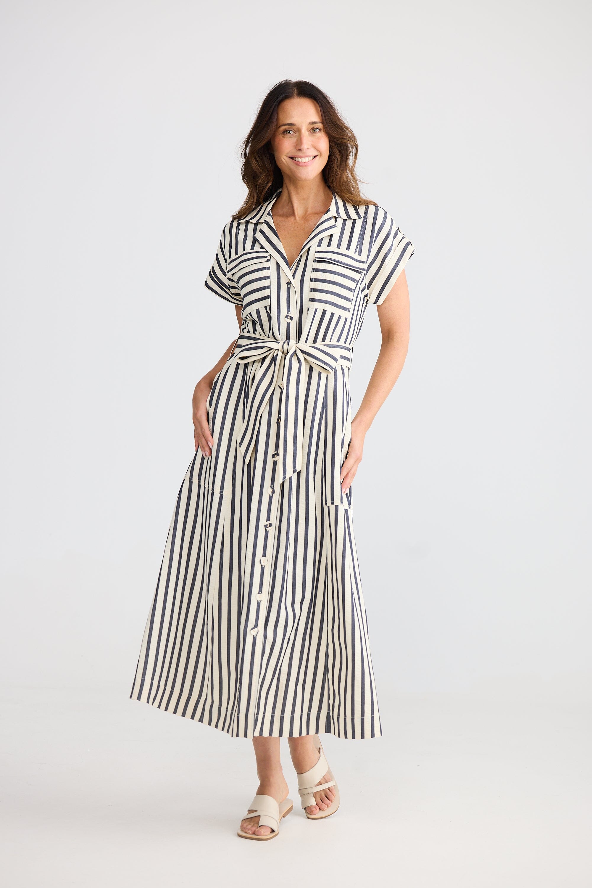 The Portia Dress in Navy Stripe Features: