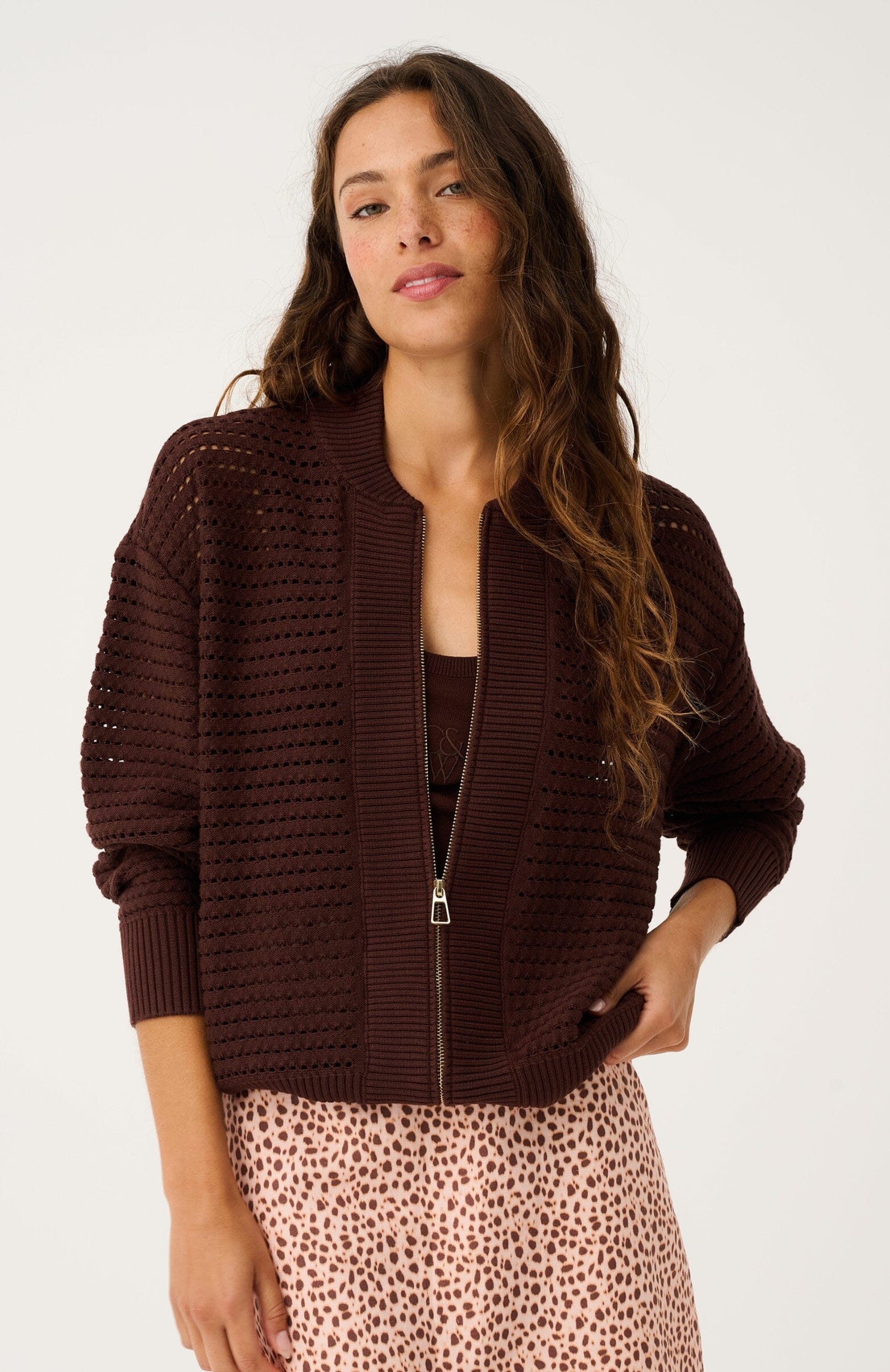 The Palmer Jacket in Truffle is a relaxed knit bomber with an open pointelle texture, ribbed trims and a turn-up hem detail for effortless everyday layering. Soft, airy and casually refined, the Palmer Jacket is the perfect knit to dress up, layer and style.
