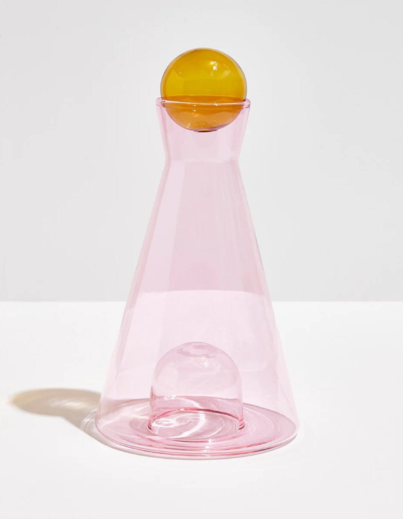 FAZEEK’s VICE VERSA CARAFE - PINK AMBER combine elegant, sculptural qualities with functional spheres. The interactive design of the carafe allows the sphere to rest inside the glass-blown mouth or sit playfully inside the base. These one-off pieces can be used as a centrepiece on your table or mantle and also act as the ideal serving vessel.