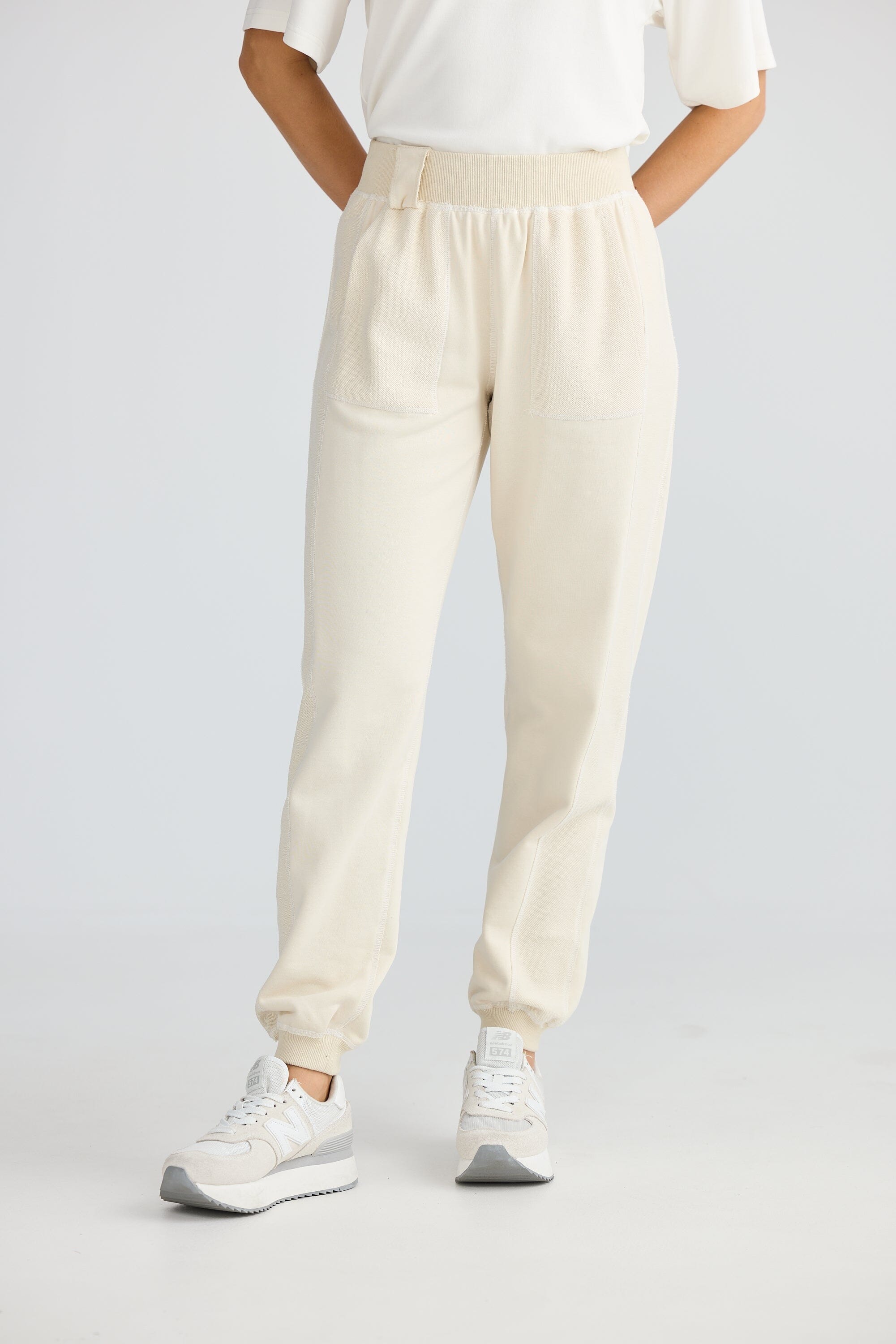 Unwind in effortless comfort with the Homelove Composure Trackpant in Oatmeal. This relaxed pull-on style features an elasticated waistband with tab detail, cutaway pockets, and cuffed hems for a polished finish. Crafted from soft French terry, it’s the perfect companion for slow days with refined ease.