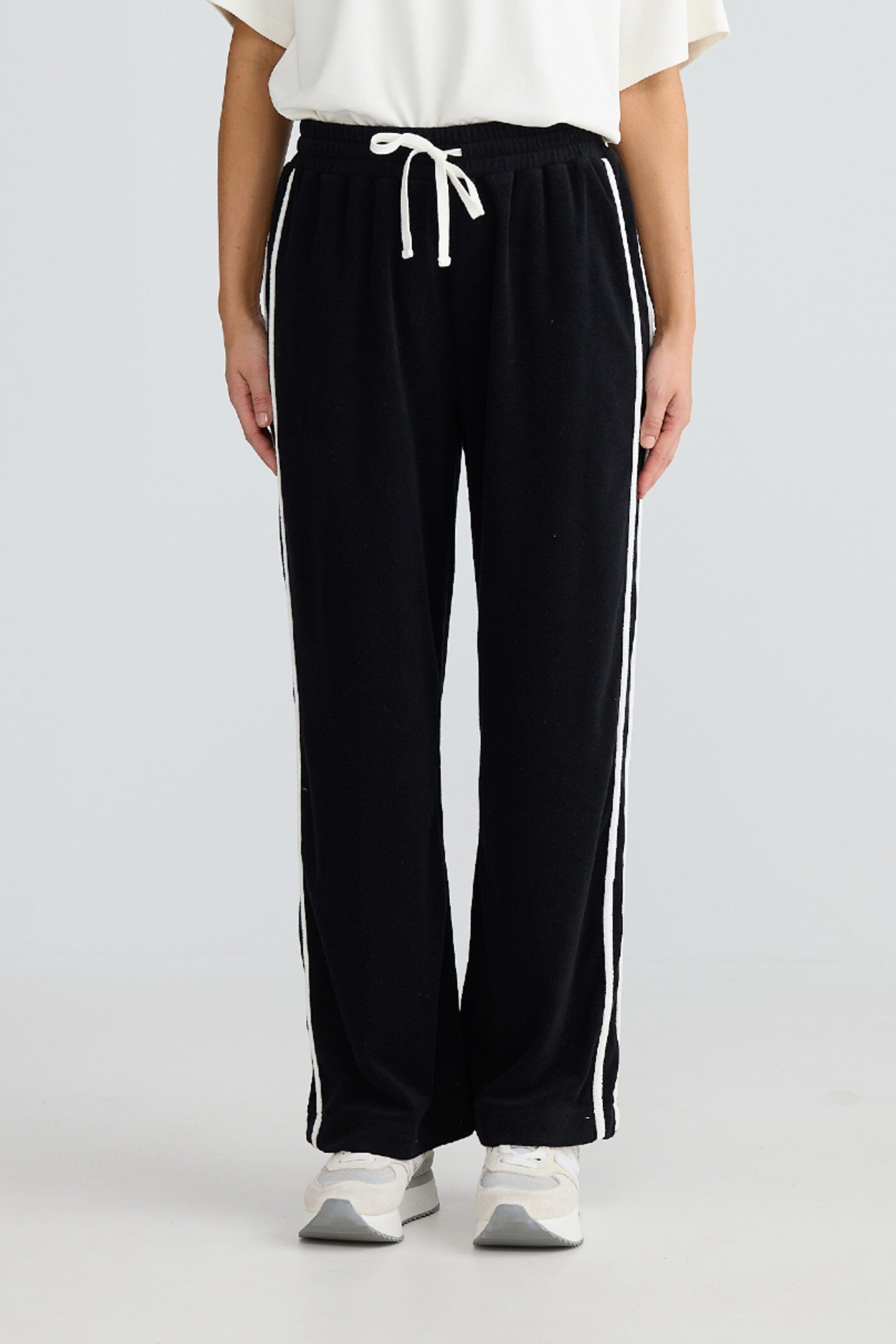 Lounge in laid-back luxury with the Homelove Floor Plan Pant in Black. This straight-leg design features an elasticated waistband with a contrast drawstring, patch pockets, and subtle contrast trim for refined detail. Crafted from soft terry towelling, it’s the perfect blend of comfort and understated style for slow days.