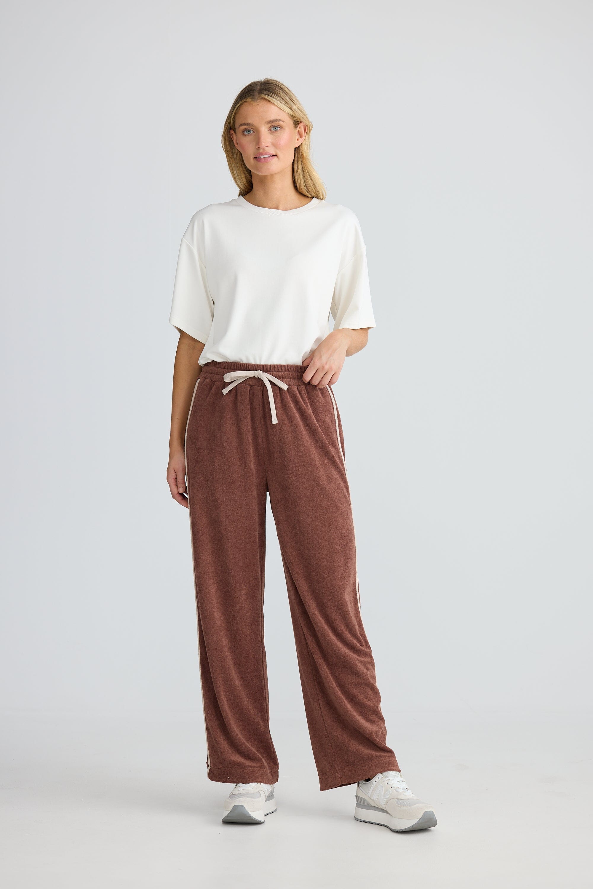 Lounge in laid-back luxury with the Homelove Floor Plan Pant in Coffee. This straight-leg design features an elasticated waistband with a contrast drawstring, patch pockets, and subtle contrast trim for refined detail. Crafted from soft terry towelling, it’s the perfect blend of comfort and understated style for slow days.