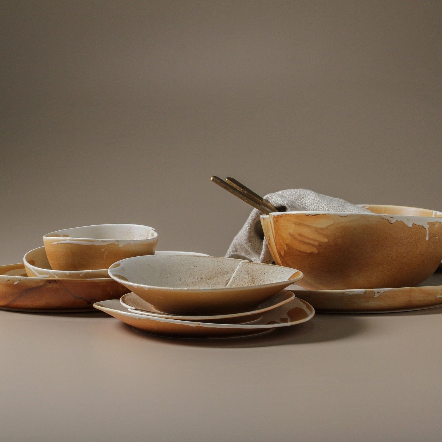Crafted for both form and function, the Kintsu Deep Dinner Plate features a porcelain surface enriched with a reactive glaze reminiscent of water's soft ripples. Its earthy wheat tones are rooted in the Sense of Reality collection’s philosophy—capturing the essence of organic movement. Perfect for hearty meals, this plate invites moments of reflection in everyday dining.
