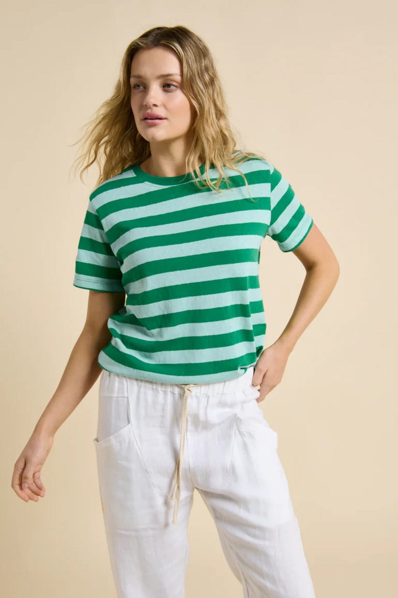 Featuring bold green and blue tones in a classic stripe, this tee brings fresh energy to your wardrobe. The soft cotton blend offers just-right stretch and a flattering cut that doesn't cling, while the linen-look fabrication keeps things breathable and effortless. Whether you're layering it up or wearing it solo, the Tilly Tee is an easy favourite you'll reach for on repeat.