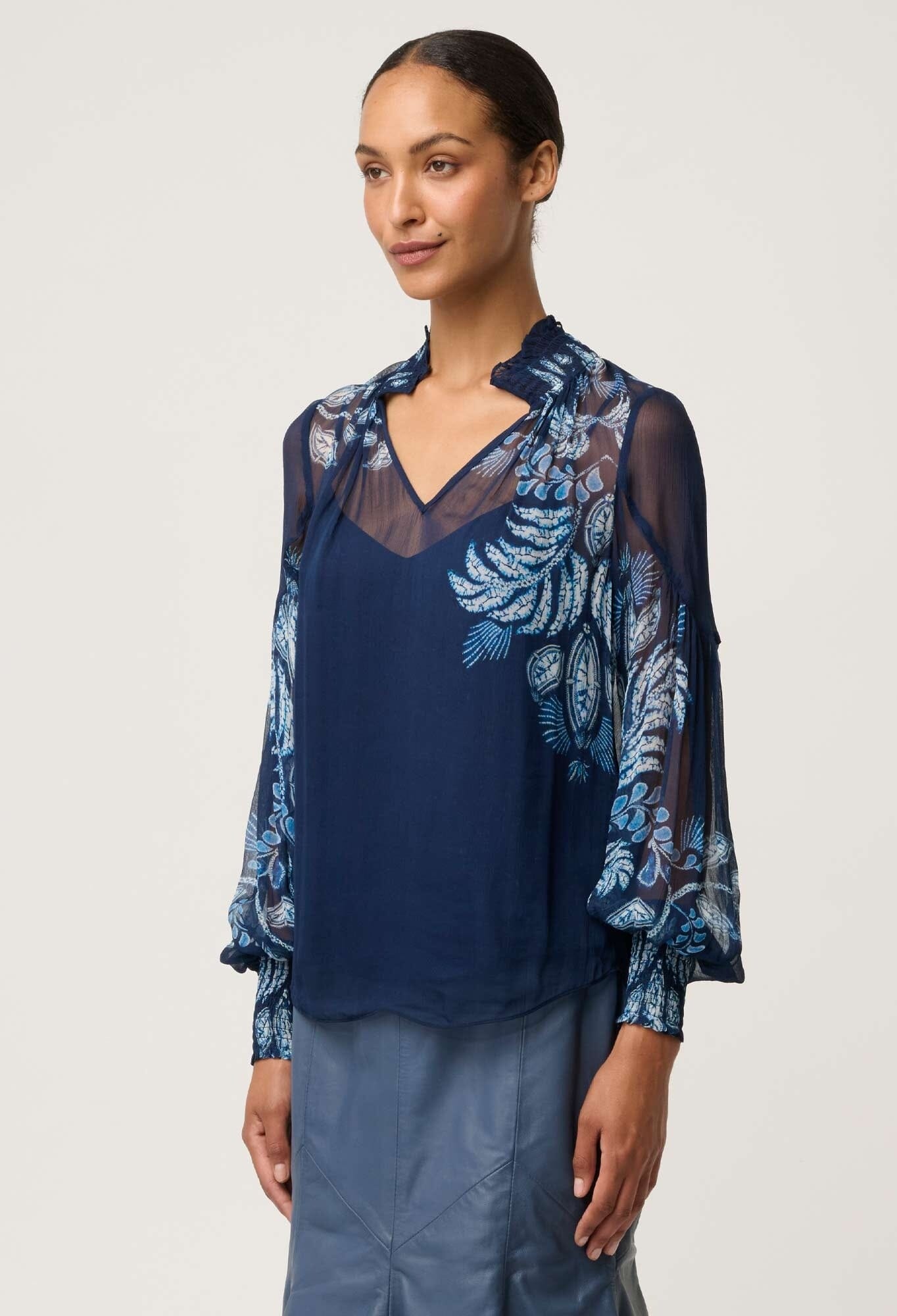 Elegant and effortlessly feminine, the Colette Viscose Chiffon Print Shirred Collar Blouse in Moonlit Batik is a refined wardrobe staple designed for modern, elevated dressing. Crafted from lightweight viscose chiffon, this blouse drapes beautifully over the body, offering a soft, airy feel with subtle sheerness. The exclusive Moonlit Batik placement print blends inky navy tones with delicate botanical motifs, creating a look that feels both timeless and contemporary.