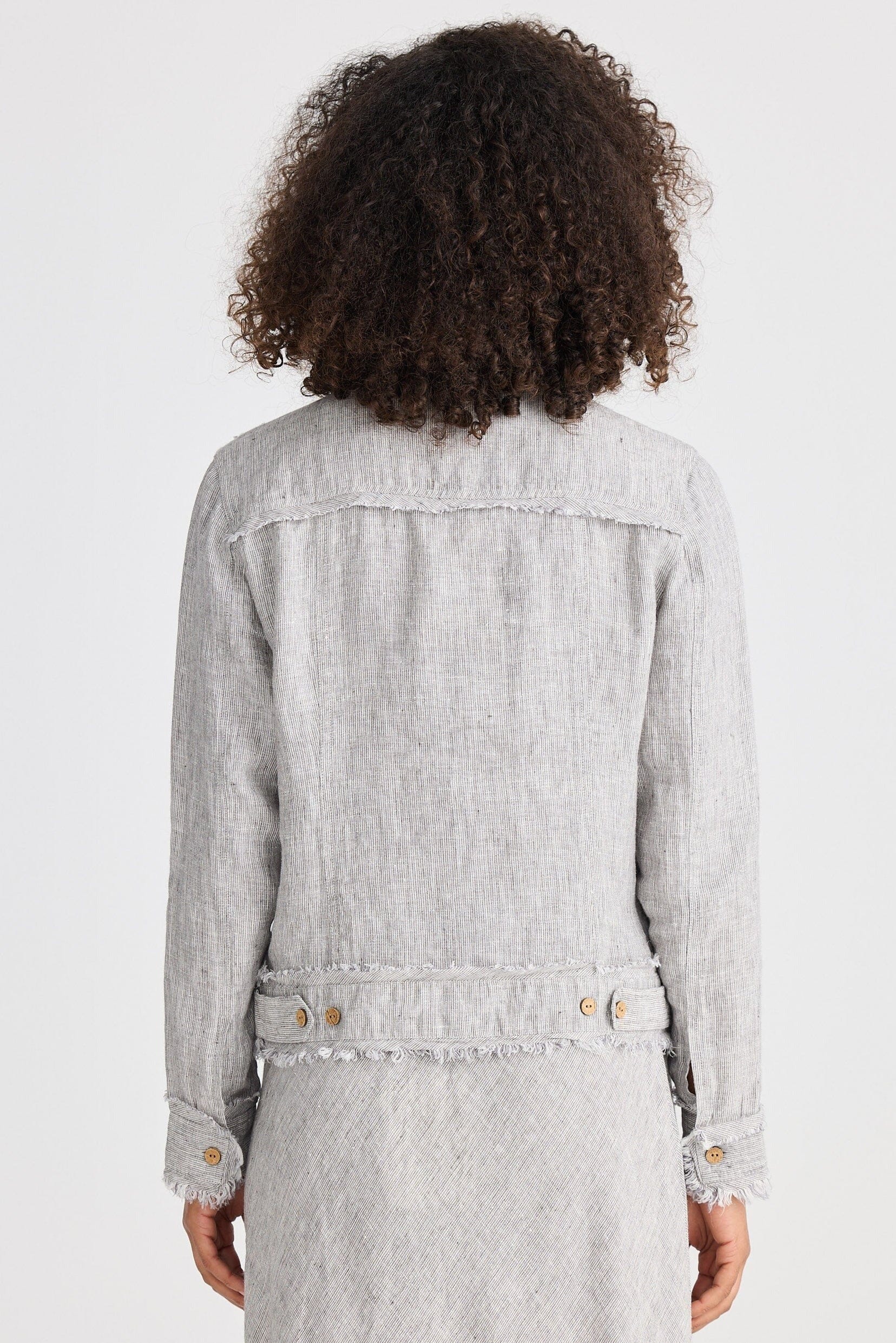 Embrace effortless elegance with our Shanty Corporation Monza Jacket in Charcoal Fleck. This structured, boxy-style jacket features a subtle striped pattern with metallic threads, front pockets for practicality, and a front-and-back yoke for a refined silhouette. The frayed trim details add an artisanal touch, making it a chic addition to any wardrobe.