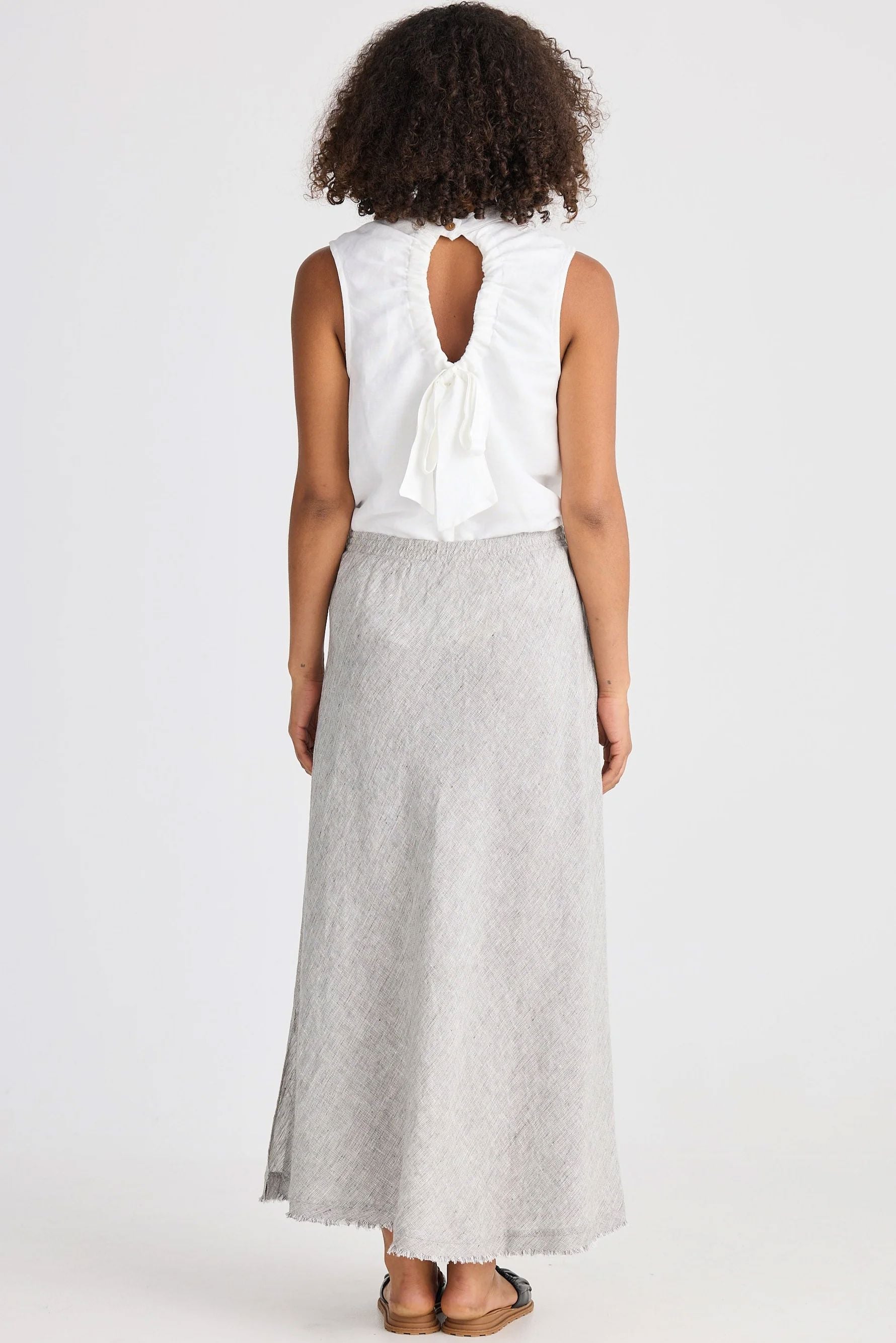 The Sicily Skirt in Charcoal Fleck is an ankle-length style cut on the bias for a graceful drape, featuring side splits, a raw edge trim, and an elasticated waistband in breathable, slub-textured linen.